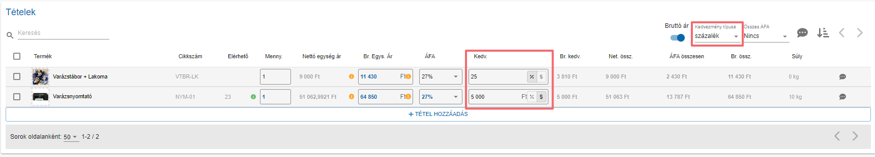 Ha a tételeknél bruttó alapú számolást adunk meg, akkor a kedvezmény beírásakor is bruttó alapon kerül kiszámításra. Értelemszerűen, ha nettó alapú számolás került megadásra, akkor nettó alapú számolás hajtódik végre.