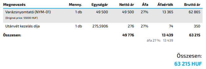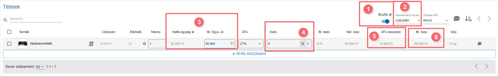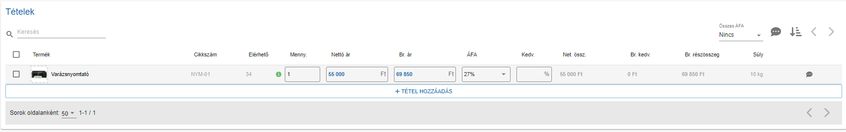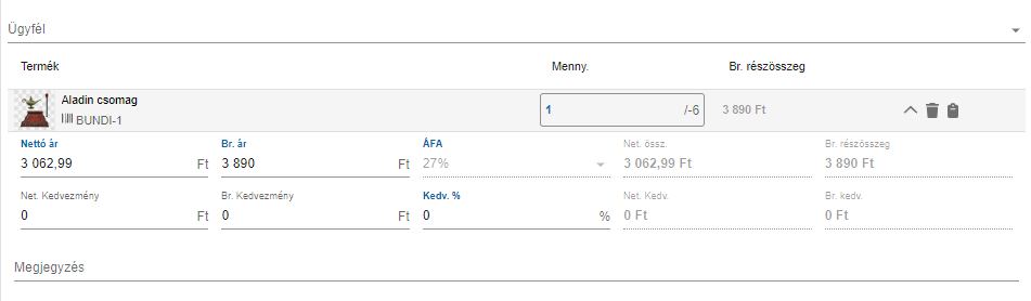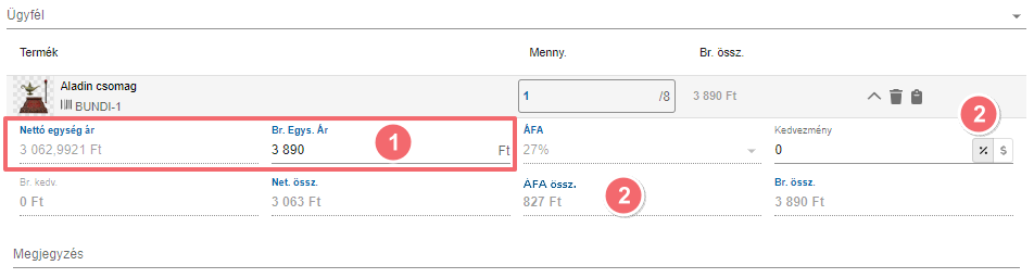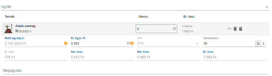 Bruttó egységár: A nettó egységár és a beállított ÁFA-ból kiszámolásra került 1 db termék ára. Kézzel átírható.