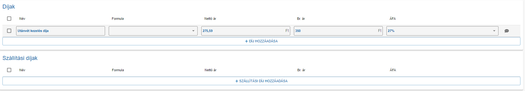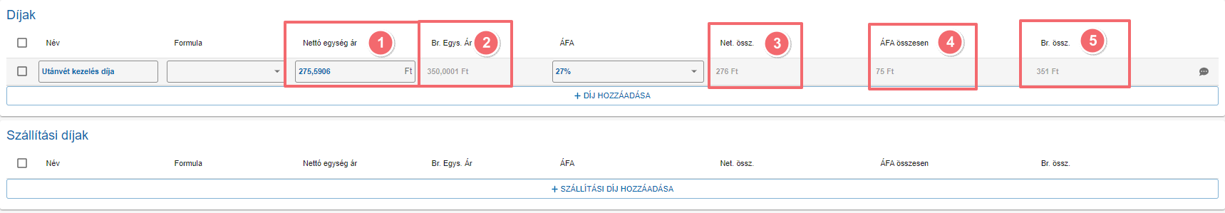 Attól függően, hogy a tételeknél bruttó vagy nettó ár alapú számítási alap került kiválasztásra dinamikusan ettől függően lesz a díjaknál és szállítási díjaknál is aktív vagy inaktív nettó egységár (1.) és bruttó egységár (2.) mező.