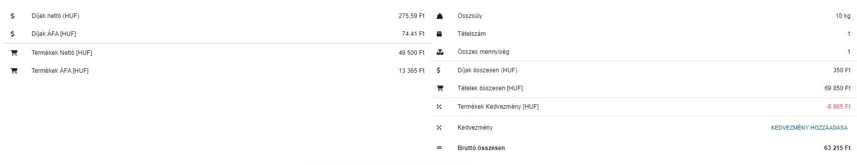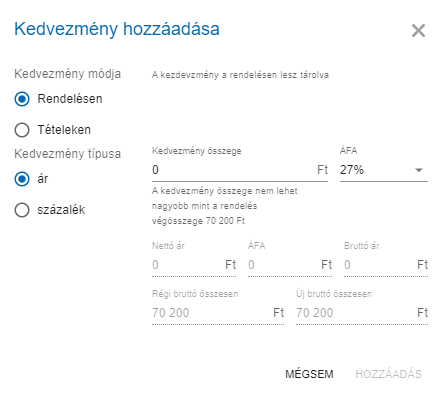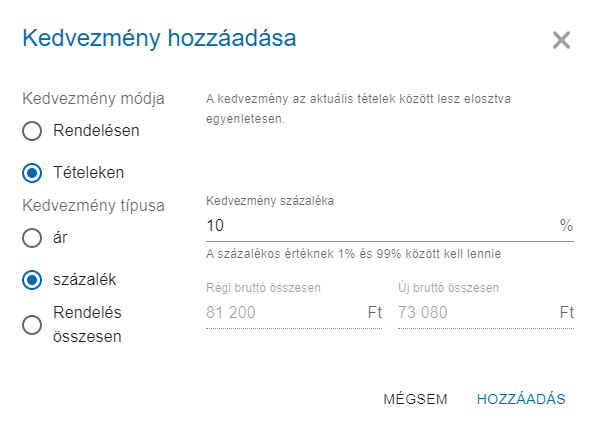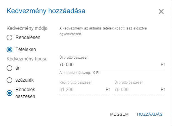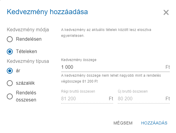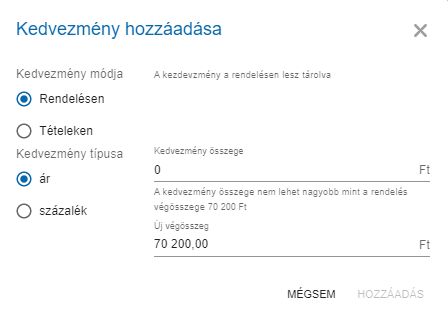 - Rendelés összesen: A rendelés végösszegét lehetséges megadni, amely által kiszámolja a rendszer, hogy az egyes tételekre arányosan mennyi kedvezményt adjon.