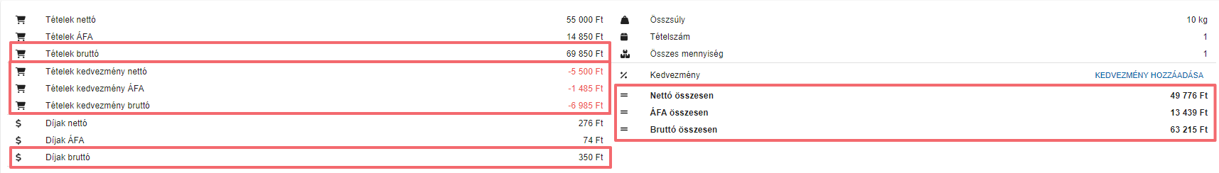Az új verzióban a bal oldalon található részletező már nem csak a termékek és díjak nettó és bruttó összegét mutatja, hanem a tételek bruttó összegét, az abból levonásra került kedvezmények nettó, ÁFA és bruttó értékét, továbbá a díjak bruttó összegét is.