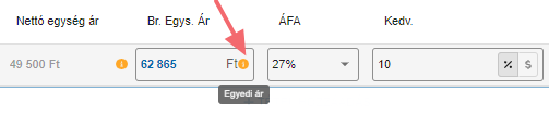 Abban az esetben ha az árat átírjuk manuálisan vagy kedvezményt adunk a tételből, a nettó- és a bruttó egységár mellett egy narancssárga i betű jelenik meg, amely jelzi, hogy az ár egyedi ár, azaz nem egyenlő a termék eredeti árával.