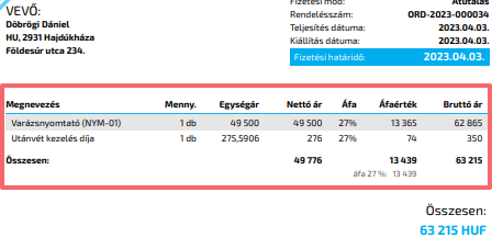 Illetve 3 új oszloppal bővül ez a blokk: nettó összesen, ÁFA összesen és bruttó összesen