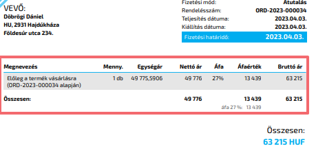 Tételes díjbekérő és előlegszámla: amennyiben ez a mező bepipálásra kerül, úgy a bizonylaton tételesen megjelenik minden termék, díj és szállítási díj.