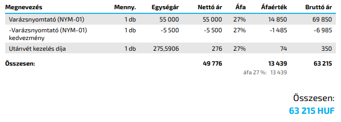 - Külön tétel: A termék nettó egységára megjelenítésre kerül a bizonylaton és az adott kedvezmény egy külön tételsorban kerül feltüntetésre.