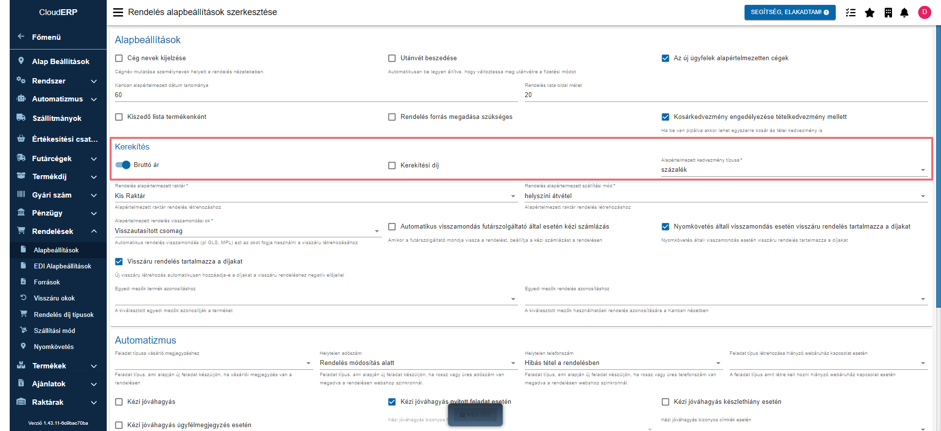 Továbbá beállítható külön a kerekítés alapja, azaz, hogy nettó vagy bruttó árból kerüljön kiszámításra a kerekítés. Ezt azért szükséges külön értékesítési csatornákra beállítani, mert a webshopokból nem örök a rendelés kerekítési beállítást.