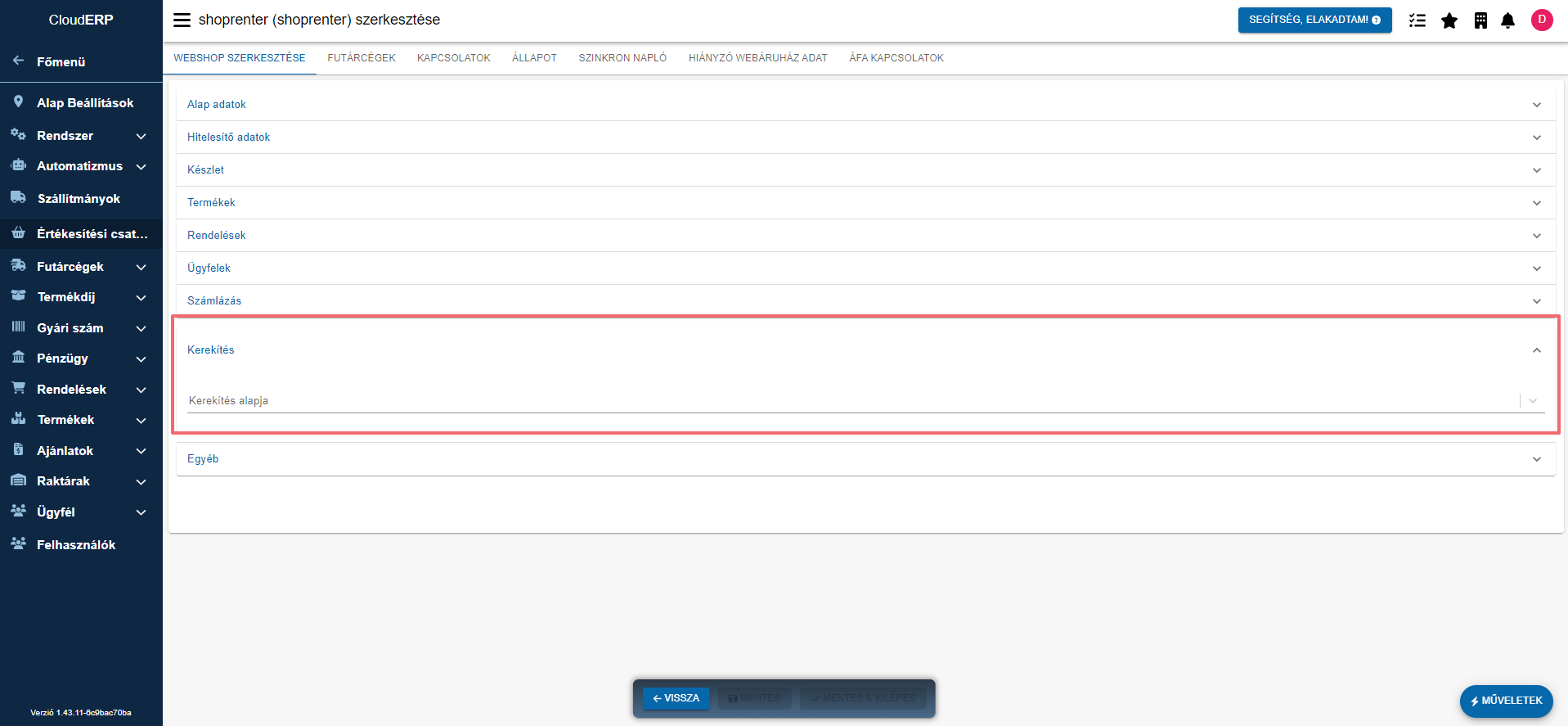Értékesítési csatornák (webshopok) kerekítési beállítása