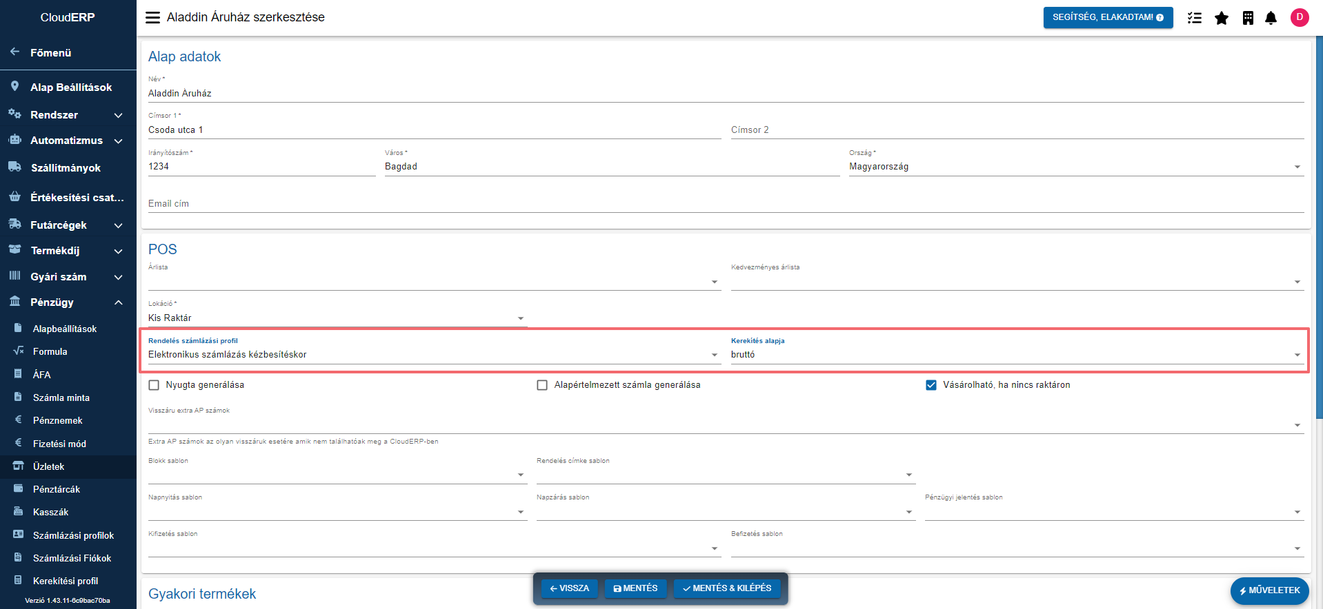 A Rendelésen a korábbi verziókban is beállítható volt a "Számlázási profil" , viszont az új verzióban a "Számlázási profil" kiválasztásakor automatikusan kiválasztásra kerül a hozzá kapcsolt "Kerekítési profil" is.