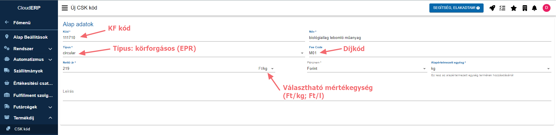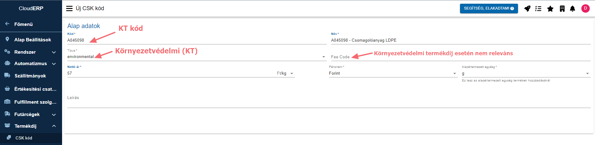 Fontos, hogy az kiterjesztett gyártói felelősség rendszere miatt a környezetvédelmi termékdíj rögzítésében jelentős változás nem történt, de ha újabb környezetvédelmi termékdíjat kívánunk rögzíteni, akkor a Termékkód mezőbe a KT kód megadása szükséges, illetve típusnál a Környezetvédelmi (KT) típus kiválasztása szükséges. A díj kód kitöltése környezetvédelmi termékdíj esetében nem szükséges.