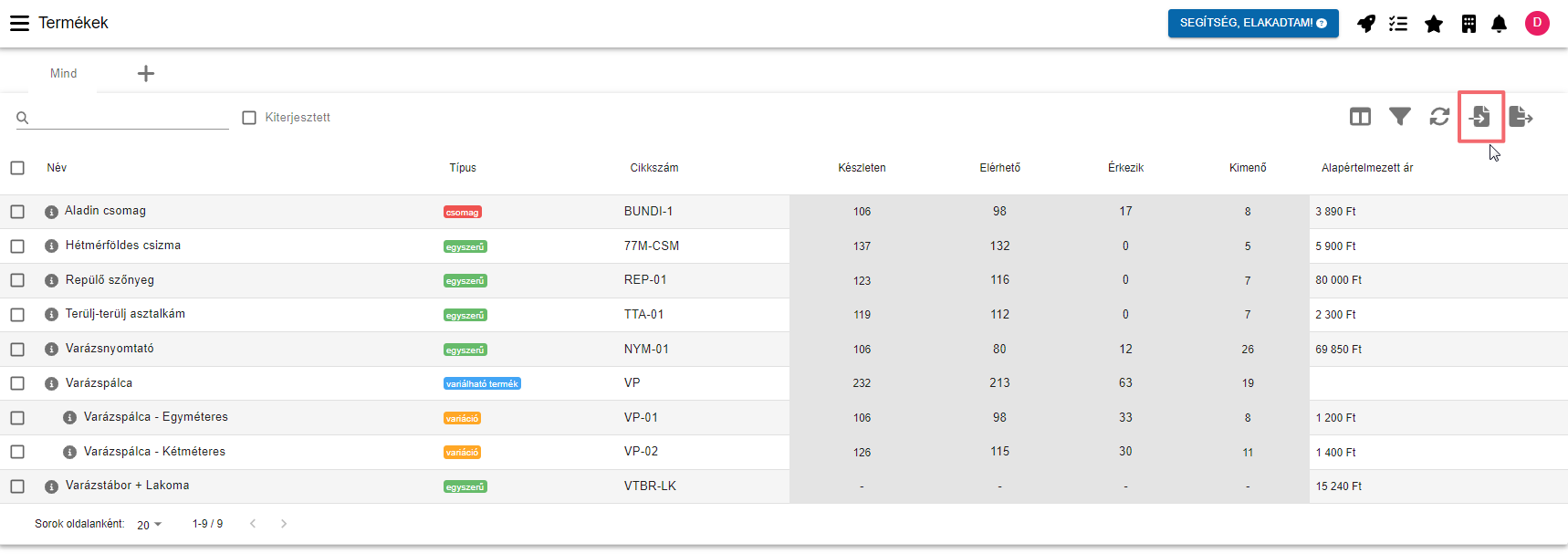 A Termékek menüben az Import gombra kattintva megjelenik a Termékek importálása ablak.