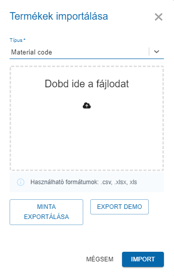 A Termékek importálása ablakban válasszuk ki a Material Code típust. Itt le tudunk tölteni mintafájlt és demo fájt is, ami segítségünkre lesz milyen adatok megadása szükséges a sikeres importhoz.