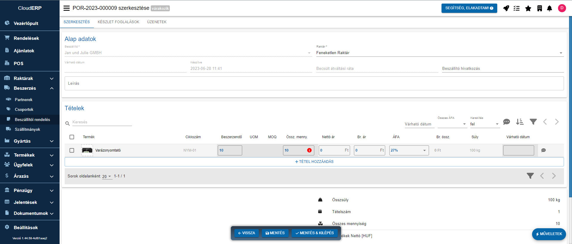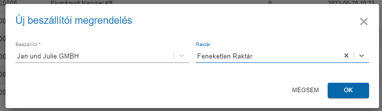 Létrehozunk egy beszállítói megrendelést, amelynek a beszállítója jelen példa esetén egy külföldi beszállító. Kiválasztunk egy raktárt.