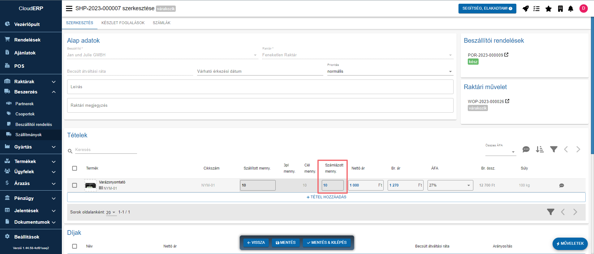 Fontos, hogy a szállítmányon a számlázott mennyiséghez beírjuk a valós számlázott mennyiséget, ugyanis a szállítmány és számla kapcsolat lesz az, amely meghatározza, hogy a termékdíj exportban milyen termékdíjak jelennek meg.