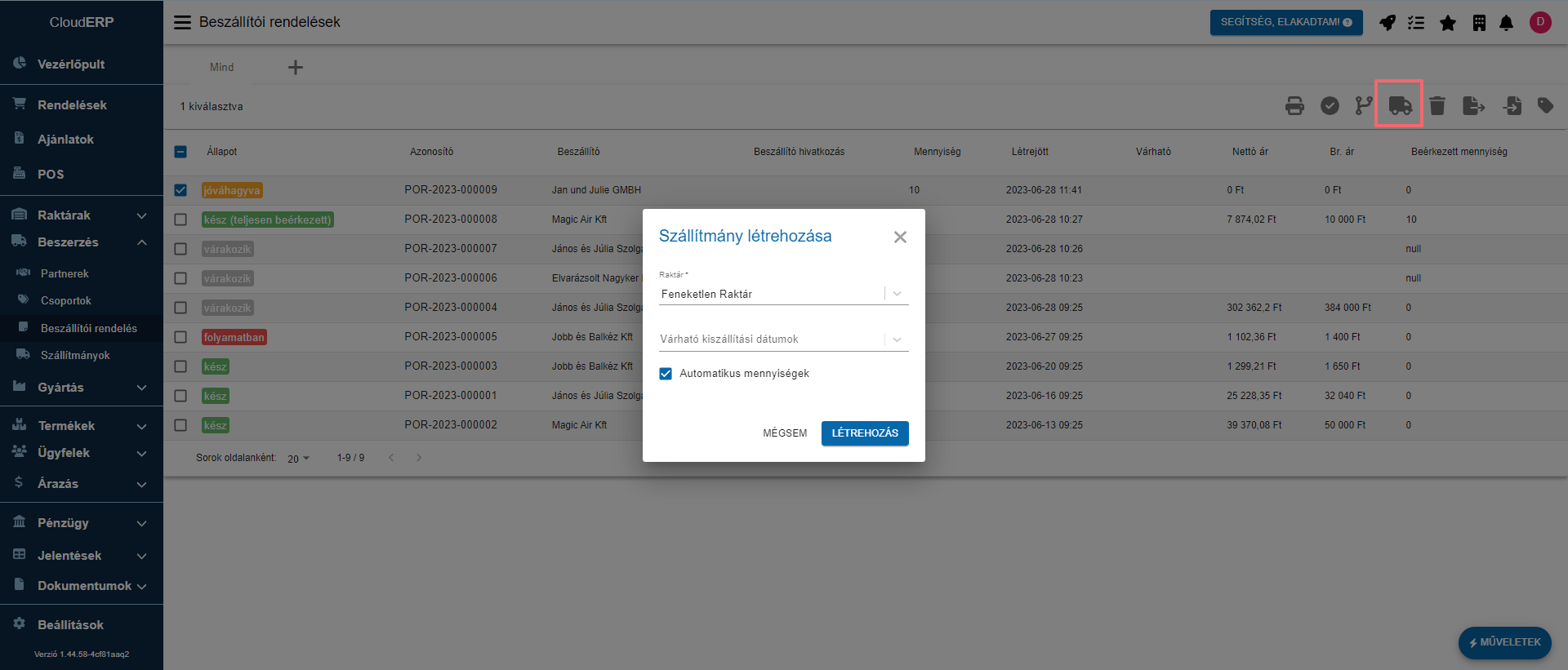 A beszállítói rendelésből egy szállítmányt hozunk létre.