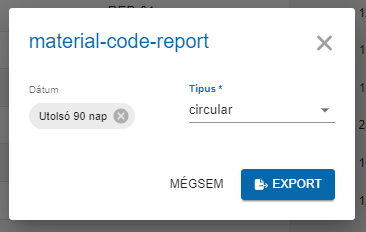A Material-Code-Reportban kiválaszthatjuk milyen dátumra vagy időintervallumra szeretnénk lekérni a kimutatást és kiválasztható a típusa.