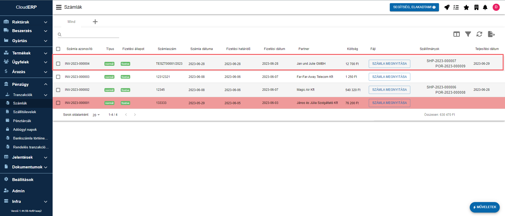 A Pénzügy/Számlák menüpontban látható a listában, hogy a számla fizetett és kapcsolódik hozzá szállítmány, illetve fizetési dátummal is rendelkezik.