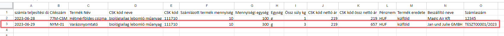 A beszállítói rendelésen rögzítjük a terméket, az NYM-01 cikkszámú termékből 10 db-ot , amelyhez 111710 KF kódú termékdíjból 300 gramm került rögzítésre termékenként.