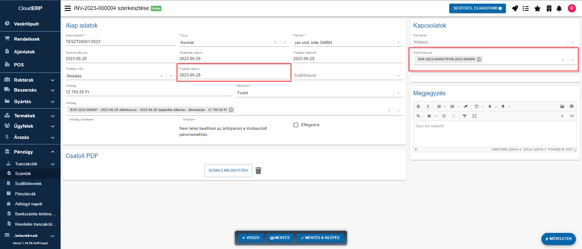 A számlán a Kapcsolatok blokkban tudjuk megadni a szállítmány azonosítóját. Továbbá fontos, hogy a számla fizetési dátum is helyesen kerüljön megadásra, ugyanis ez határozza meg, hogy a termékdíj exportban mikor jelenik meg a termékdíj.