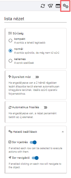 A jobb oldalon található ikonra kattintva beállítható, hogy milyen adatokat és műveleteket szeretnénk megjeleníteni az adott nézetben.