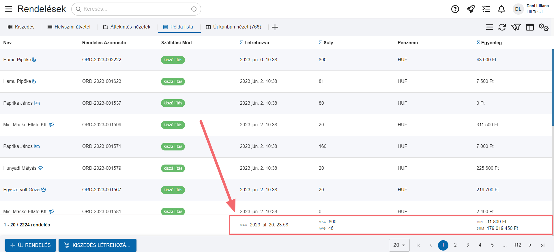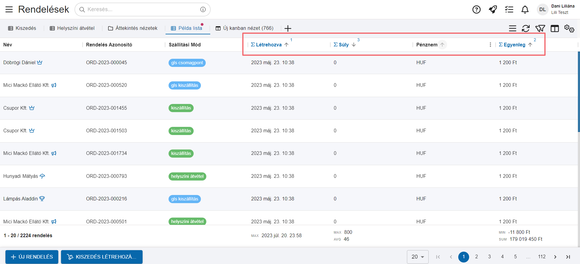 A lenti képen is látható ahogy az első oszlopba (balra) kitűzésre került a Név az utolsó oszlopba (jobbra) pedig a rendelés összege.