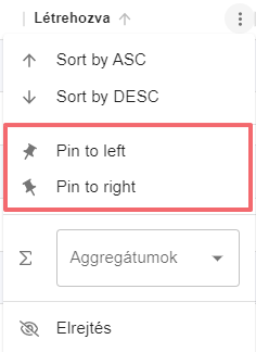 Továbbá ki tudjuk tűzni jobbra vagy balra az adott oszlopot. Ez azért hasznos, mert ha nagyon sok oszlopból álló táblázatot vizsgálunk, akkor lehetőségünk van az első és az utolsó oszlopba olyan információkat kitűzni, amelyek által kevesebbet kell oda-vissza görgetni az oszlopok között.
