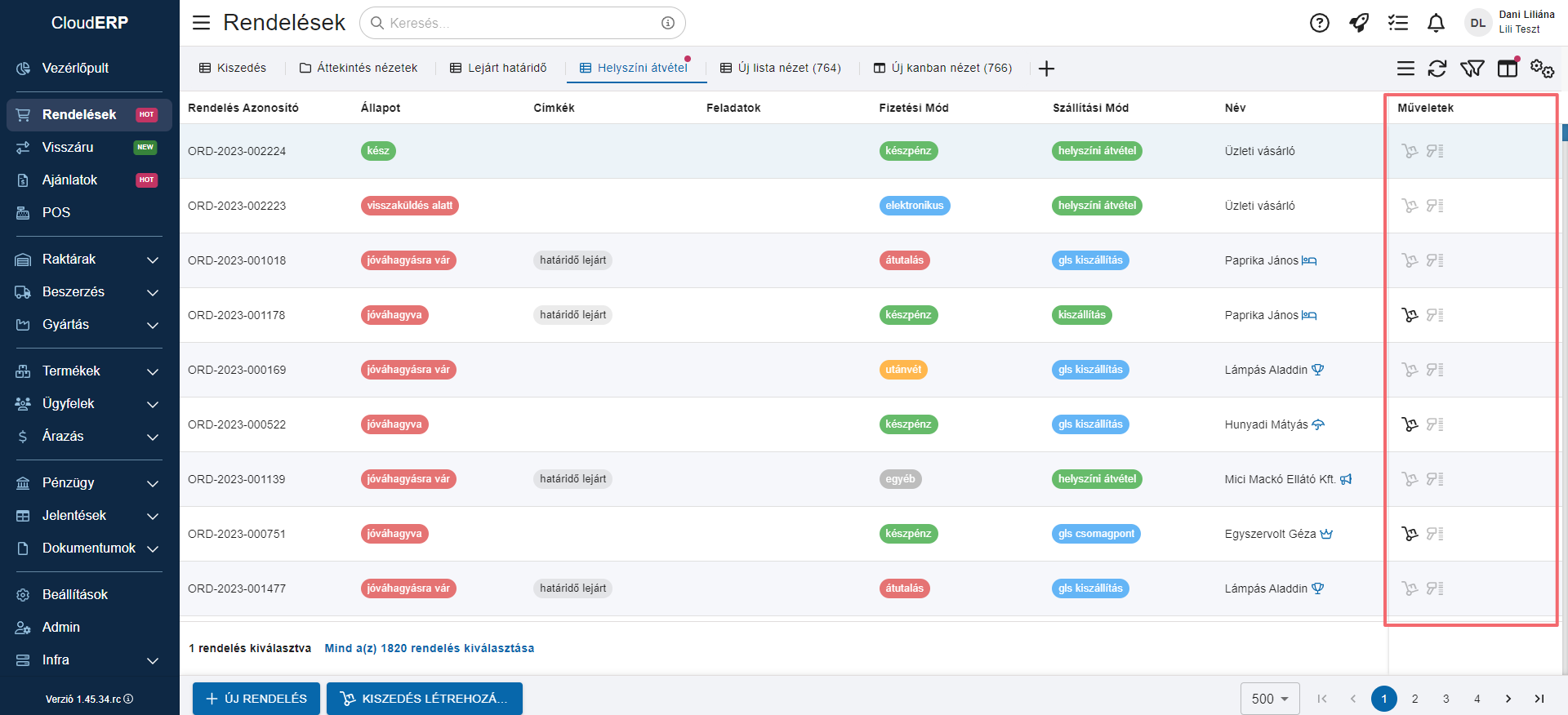 Az alábbi képen látható egy olyan rendelés, amelyen szabadon rendezésre kerültek az oszlopok és az utolsó oszlopban több művelet is automatikusan elérhető és végrehajtható (ellenőrzés, helyszíni átvétel, csomagolás, futárcímke nyomtatás).
