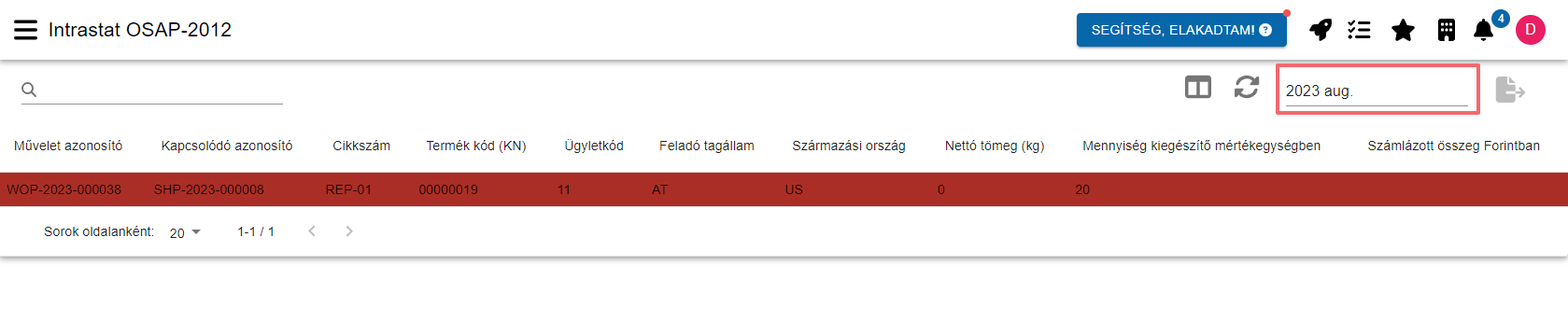 A fenti képen látszik, hogy pirossal jelenik meg az adott szállítmány és a jobb felső sarokban található export gomb is inaktív. Ennek oka, hogy ilyenkor még hiányzik valami olyan adat a riportból, ami megfelelő Intrastat jelentést tudna generálni.