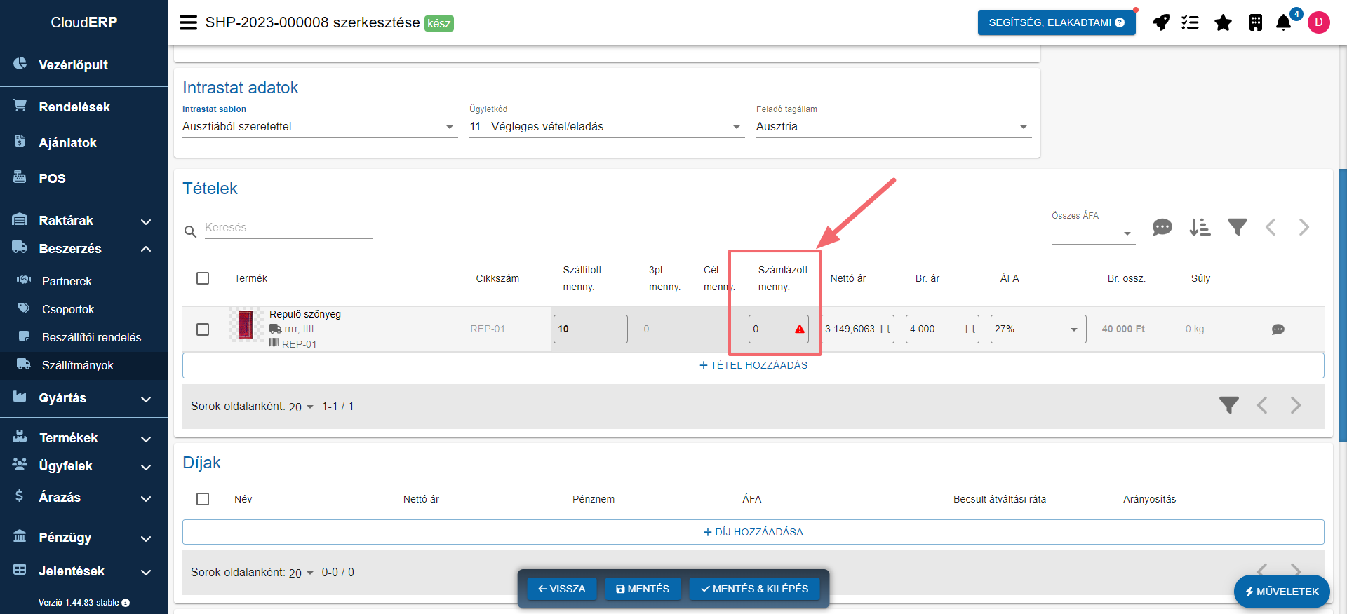 Létrehozunk egy szállítmányt az adott beszállítóval a Szállítmányok menüben.