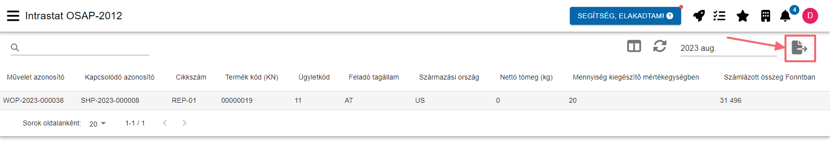 Ha egyetlen sorban sem található hiba, akkor az export gomb a jobb felső sarokban aktívvá válik és lehetőségünk van exportálni az Intrastat jelentést.