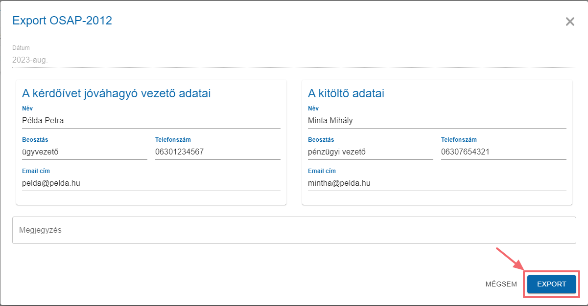 Az exportra kattintva megjelenik egy ablak, amelyben a kérdőívet jóváhagyó vezető adatait és a kitöltő adatait meg kell adni. Ez az Intrastat jelentéshez szükséges, abban jelennek meg ezek az adatok. Minden mező kitöltése kötelező a megjegyzés kivételével!