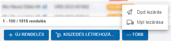 A Rendelések menüben ha nincs egy rendelés sem kijelölve, akkor a képernyő alján található műveletsorban a ...Több opciót választva jelenik meg a DPD és MPL lezárása művelet.