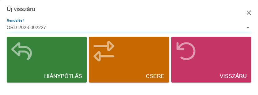 Ha kiválasztottuk a megfelelő rendelést, akkor 3 típus közül tudunk választani, amelyek már korábban is elérhetőek voltak a rendszerben: Hiánypótlás, Csere és Visszáru.