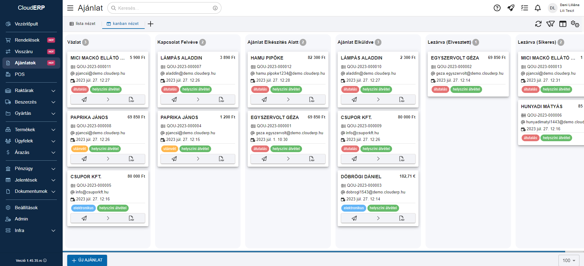 Az ajánlatok a korábbi verzióban is elérhető volt, viszont jelentős újdonság ezen a felületen is, hogy már kanban nézetet is tudunk létrehozni, illetve a szűrők, oszlopok sokkal több információ megjelenítésére és keresésére adnak lehetőséget.