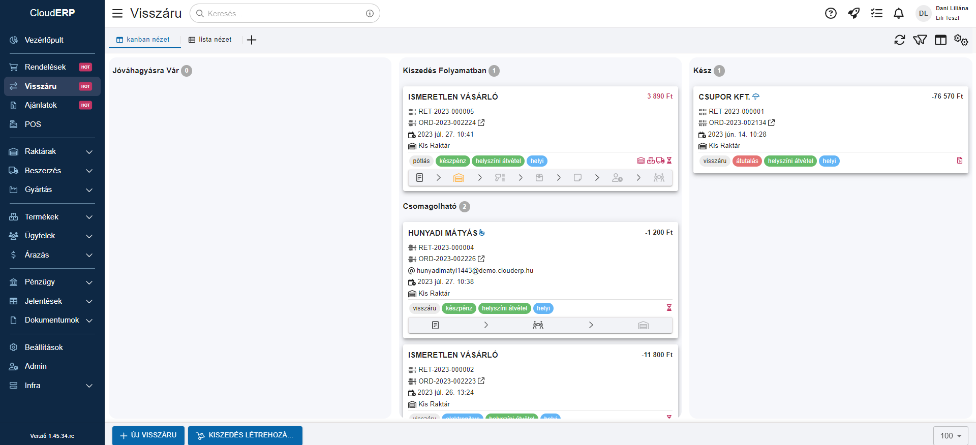Ha rögzítettünk mindent a visszáru bizonylaton, akkor megjelenik a lista nézetben és a kanban nézetben is a megfelelő oszlopban.