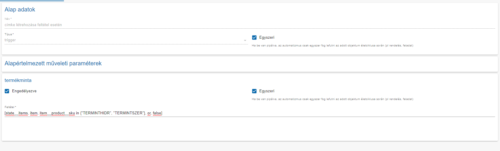 Ha azt szeretnénk hogy automatikusan megkapja a rendelés a kívánt címkét, amikor a rendelés adott cikkszámot vagy cikkszámokat tartalmaz, akkor azt az alábbi módon kell beállítanunk.