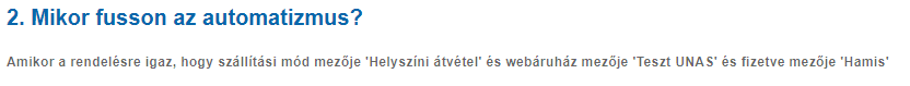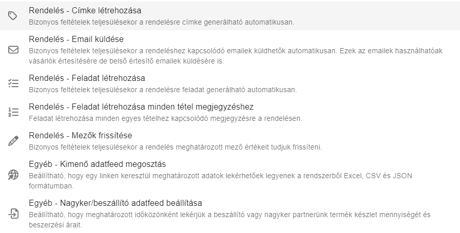 A rendszerben több automatizmus létrehozására van lehetőség, amelyeknek általános lényege, hogy a rendszer az általunk beállított feltételek teljesülésekor végrehajt bizonyos műveleteket automatikusan. Például címkét hoz létre a rendelésre, e-mail küld ki a vevőnek, feladatot hoz létre a rendelésre, stb.