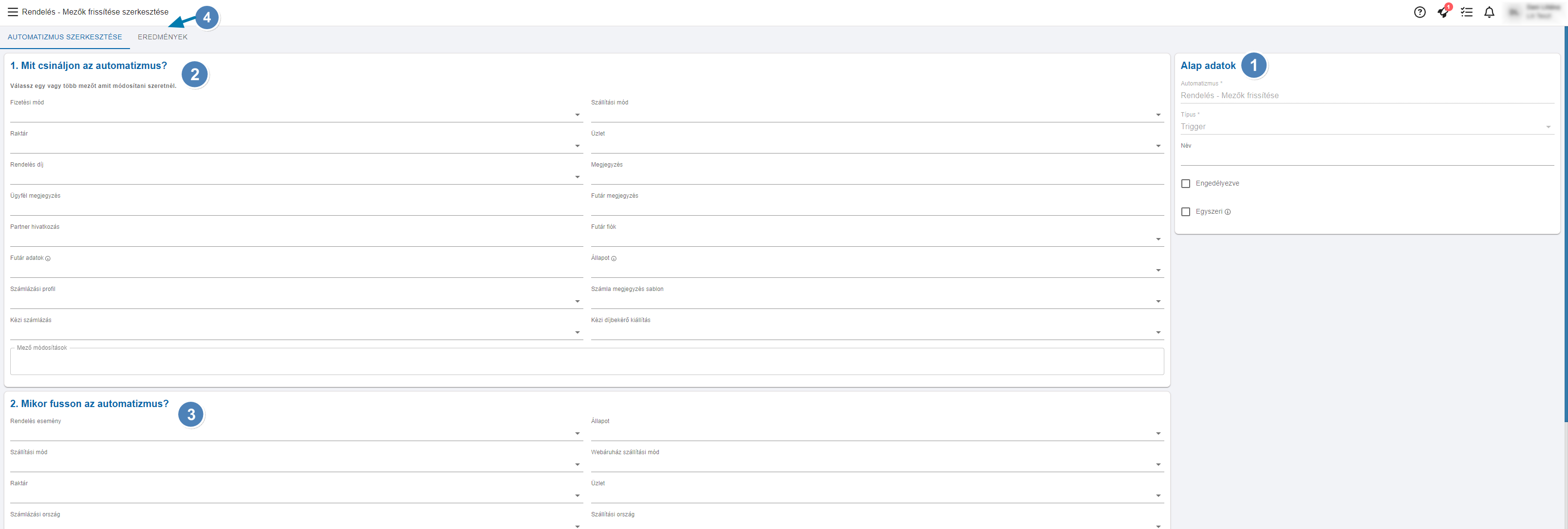 Az 1. blokk az Alapadatok ahol láthatjuk az automatizmus típusát, illetve megadhatjuk az Automatizmus nevét. Itt érdemes olyan nevet adni, amiből egyértelműen azonosítható hogy melyik automatizmusról van szó.