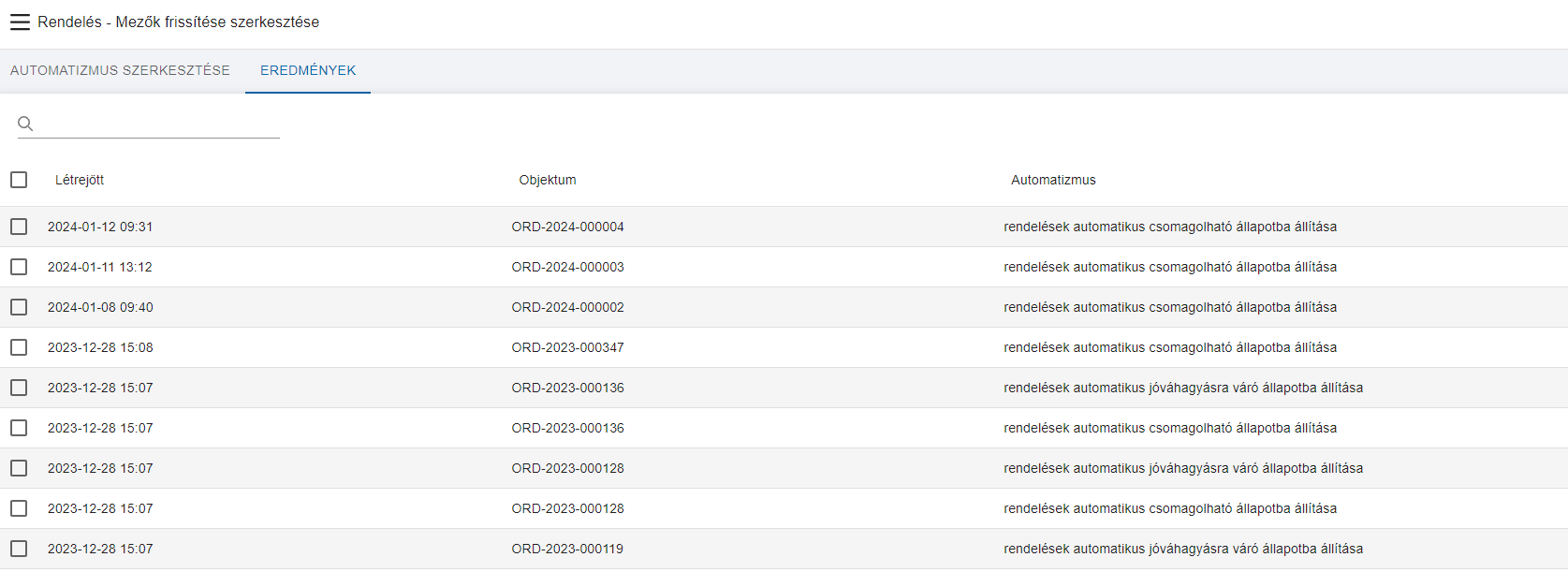 Végül pedig a 4. blokkban ami egy külön fülön található az adott automatizmus Eredményeit láthatjuk, azaz hogy mikor, milyen objektum kapcsán futott le az adott automatizmus már, továbbá ha esetleg hiba van, akkor azt a rendszer itt kijelzi. Ez nyilvánvalóan egy új automatizmus esetében üres, mert még egyetlen alkalommal sem futhatott le, de meglévők esetén fogunk találni a listában találatokat.