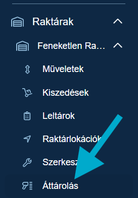 A Raktárak/ Adott Raktár/ Áttárolás menüben érjük el a funkciót.