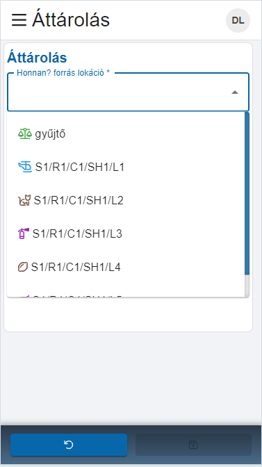 Ha nem vonalkód olvasóval olvassuk be a lokációkat, akkor a mezőbe katintva egy listából kiválaszthatóka a raktárhoz tartozó lokációk. A könnyű felismerhetőség érdekében a lokáció neve előtt az ikonja is látható.