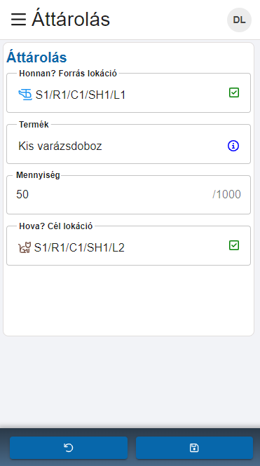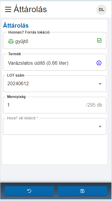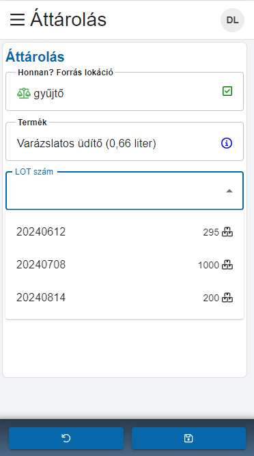 LOT szám esetén egy termékszámhoz több mennyiség tartozik, így ebben az esetben egyszerre egy áttárolás egy LOT számra történhet. Ez azt jelenti, hogy ha beolvasta/kiválasztotta a felhasználó a terméket és a rendszer látja, hogy LOT számos a termék, akkor ki tudja választani/le tudja olvasni a LOT számot a felhasználó, de összesen csak 1 db termékszámot tud, ezután inaktívvá válik a mező és csak mennyiséget tud megadni. Tehát ha több eltérő LOT számú terméket akar átmozgatni, akkor az több áttároláson lehetséges.