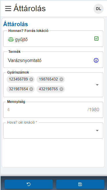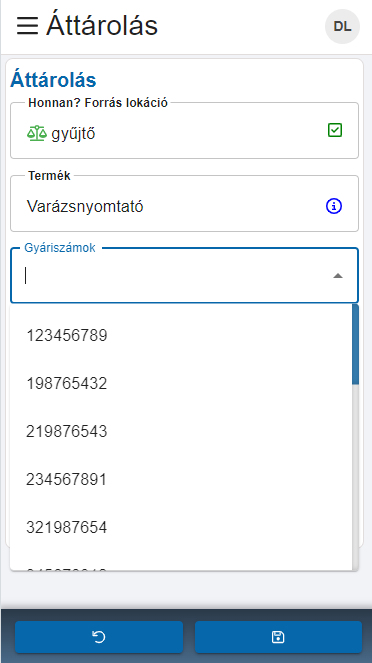 Gyári szám esetén viszont egy termékszámhoz 1 db termék tartozik, így itt lehetséges az, hogy egy áttároláson belül több gyáriszám áttárolása történjen meg. Ekkor a termék kiválasztása után, a felhasználó több gyáriszámot kiválaszthat/leolvashat, amik a mennyiség mezőt 1-el növelik.