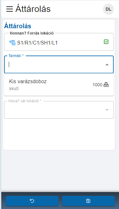Ha megtörtént a lokáció beolvasása, análkül hogy át kellene kattintania a következő mezőbe, automatikusan átugrik a rendszer a Termék választó mezőre. Ezzel egyidejűleg a Honnan mező inaktívvá válik, tehát már lehetséges szerkeszteni. Ha szerkeszteni szeretnénk, akkor a Visszállíáts gombbal lehet újrakezdeni az áttárolást.