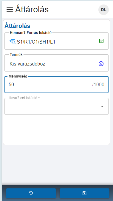Ha beírásra került a mennyiség, akkor inaktívvá válik ez a mező és aktívvá válik a Hova mező is. Ide szintén manuálisan beírhatjuk a cél lokációt, de ha vonalkódolvasóval beolvasunk egy lokáciot, akkor a rendszer automatikusan kitölti, tehát nem a honnan mezőt módosítja, hanem felismeri hogy ez egy másik lokáció, ami azért került beolvasásra, mert ide akarjuk áttárolni a termékeket.
