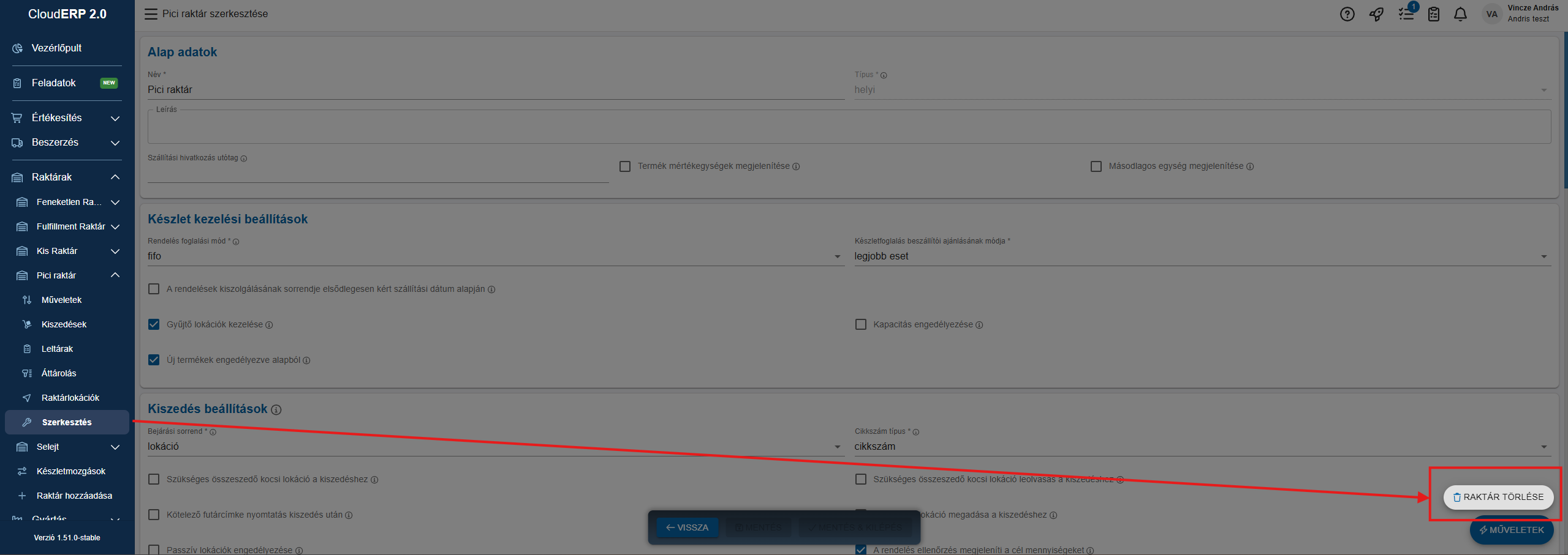Utánna a raktár szerkesztésében a műveletek alatt lesz lehetőség a törlésre: