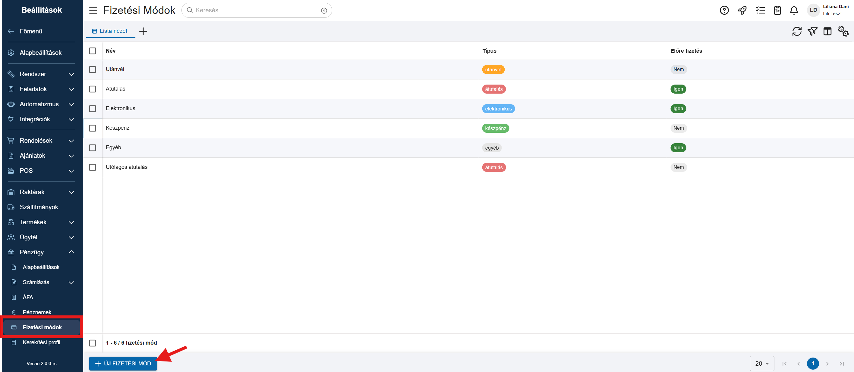 A rendszerben a Beállítások/ Pénzügy/ Fizetési módok menüben van lehetőségünk a fizetési módokat létrehozni, törölni.