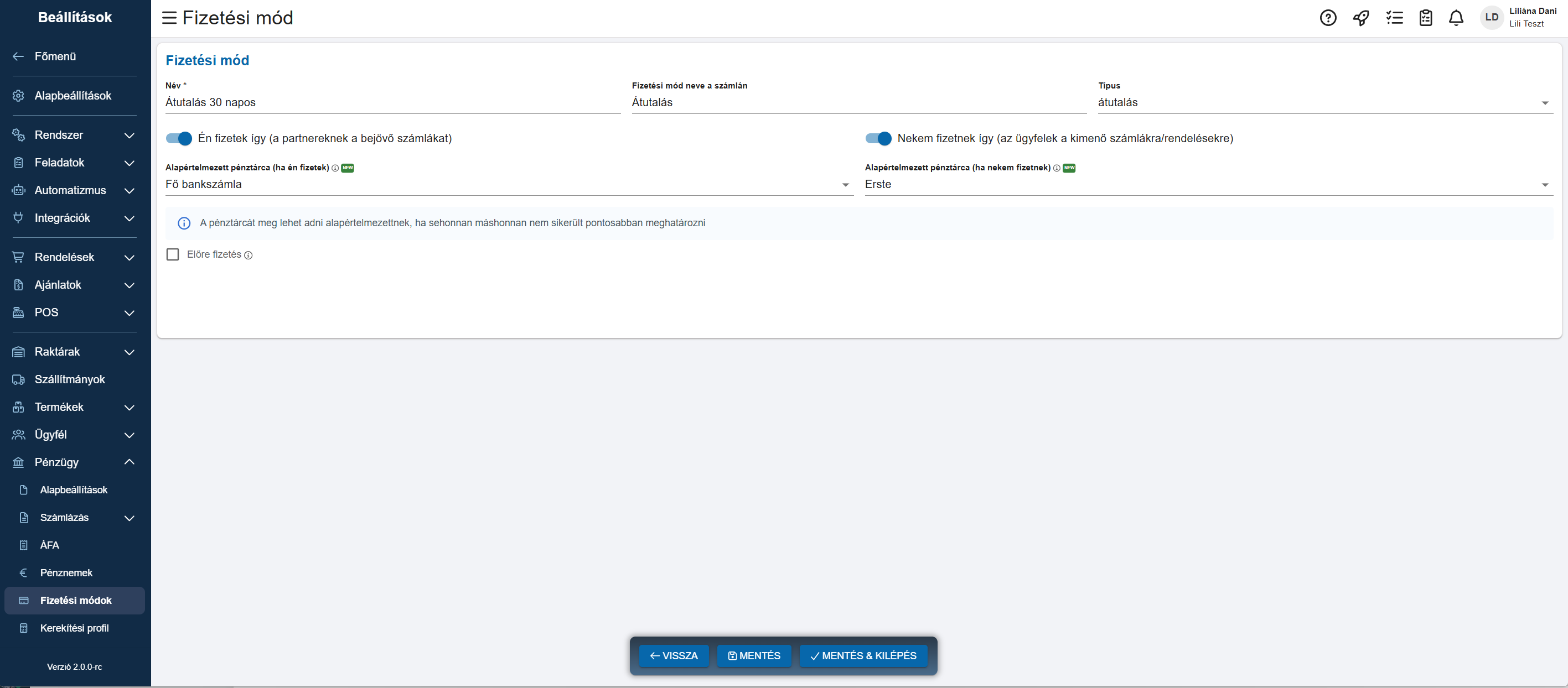 Az új beállításokkal a rendszer mindig az adott irányhoz megfelelő fizetési módokat kínálja fel, amikor új rendelést, szállítmányt vagy tranzakciót rögzítünk. - Az irányok később a pénztárcák automatikus hozzárendelésében is fontos szerepet kapnak, ezzel tovább csökkentve a manuális beállítások szükségességét.