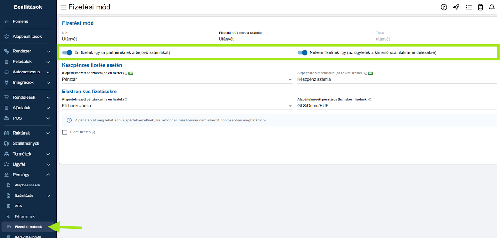 Fontos! Az Előre fizetés opció csak abban az esetben kapcsolható be, ha a Fizetési módnál engedélyezve van a "Nekem fizetnek így (az ügyfelek a kimenő számlákra/rendelésekre)". Ennek oka, hogy ez továbbra is a rendelésekhez kapcsolódó automatizmusokat szabályozza és más esetre nincs hatással.