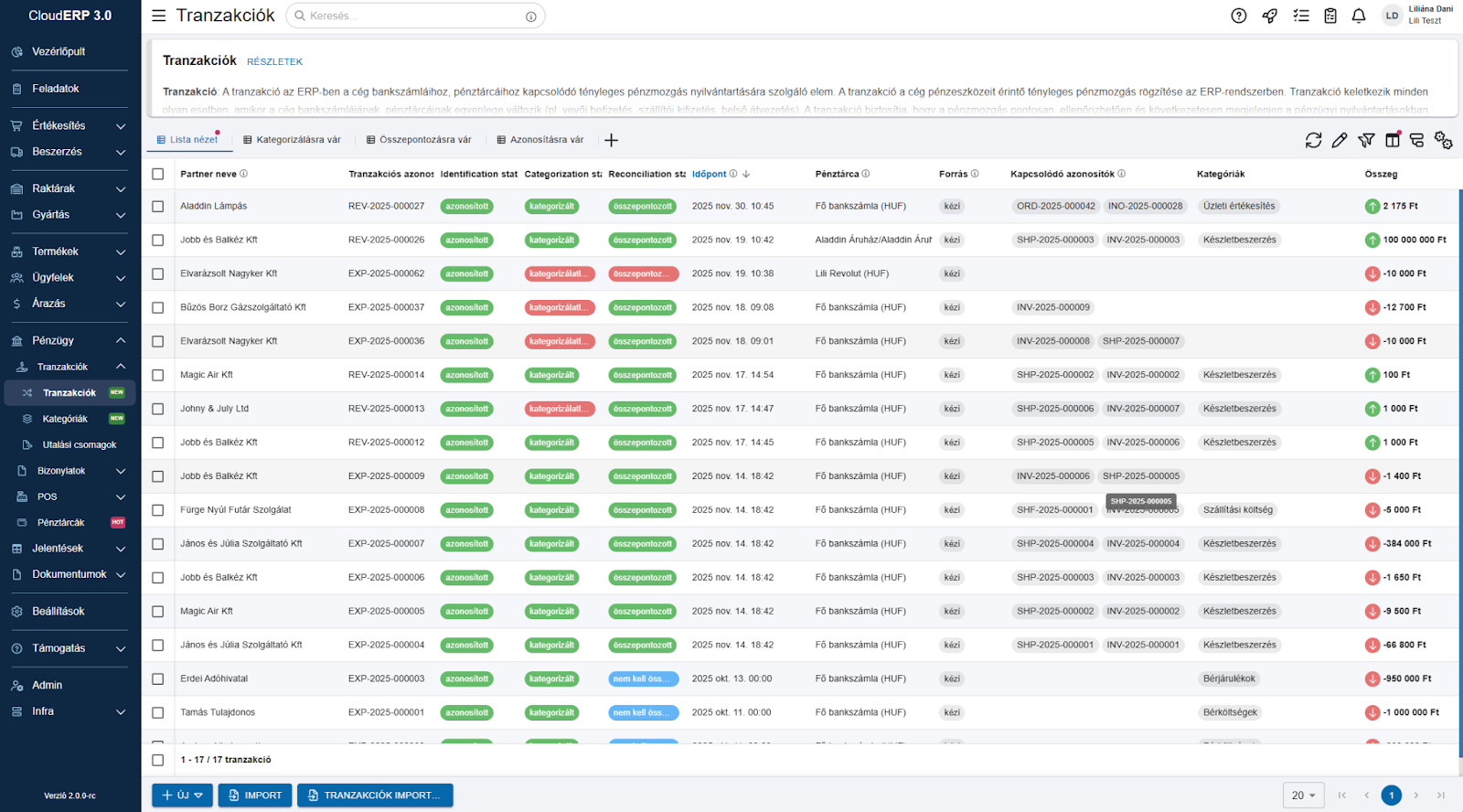 A tranzakció az ERP-ben a cég bankszámláihoz, pénztárcáihoz kapcsolódó tényleges pénzmozgás nyilvántartására szolgáló elem. A tranzakció a cég pénzeszközeit érintő tényleges pénzmozgás rögzítése az ERP-rendszerben. Tranzakció keletkezik minden olyan esetben, amikor a cég bankszámlájának, pénztárcájnak egyenlege változik (pl. vevői befizetés, szállítói kifizetés, belső átvezetés). A tranzakció biztosítja, hogy a pénzmozgás pontosan, ellenőrizhetően és következetesen megjelenjen a pénzügyi nyilvántartásokban.