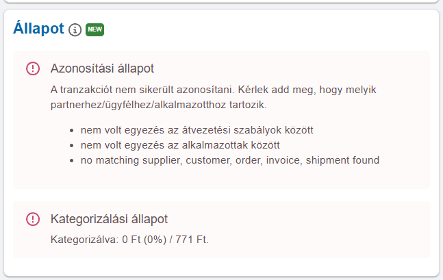 - Azonosítatlan: A tranzakción nem lehetett meghatározni és manuálisan sem került megadásra ki az ügyfél/ partner vagy alkalmazott, akihez kapcsolódik.